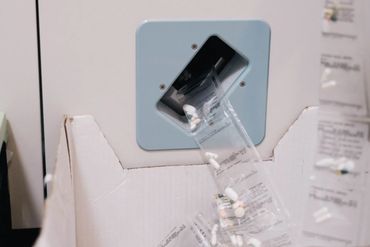 D’aquesta manera aconseguim que el pacient prengui la medicació adequada, en la dosi i temps correcte, ja que la medicació ve distribuïda mitjançant bosses d’una sola toma on apareix el dia i l’hora en que s’ha de prendre, a més del nom i carecterístiques de cada un dels medicaments que van dintra .
